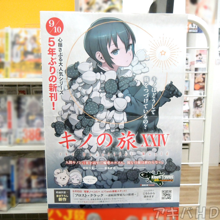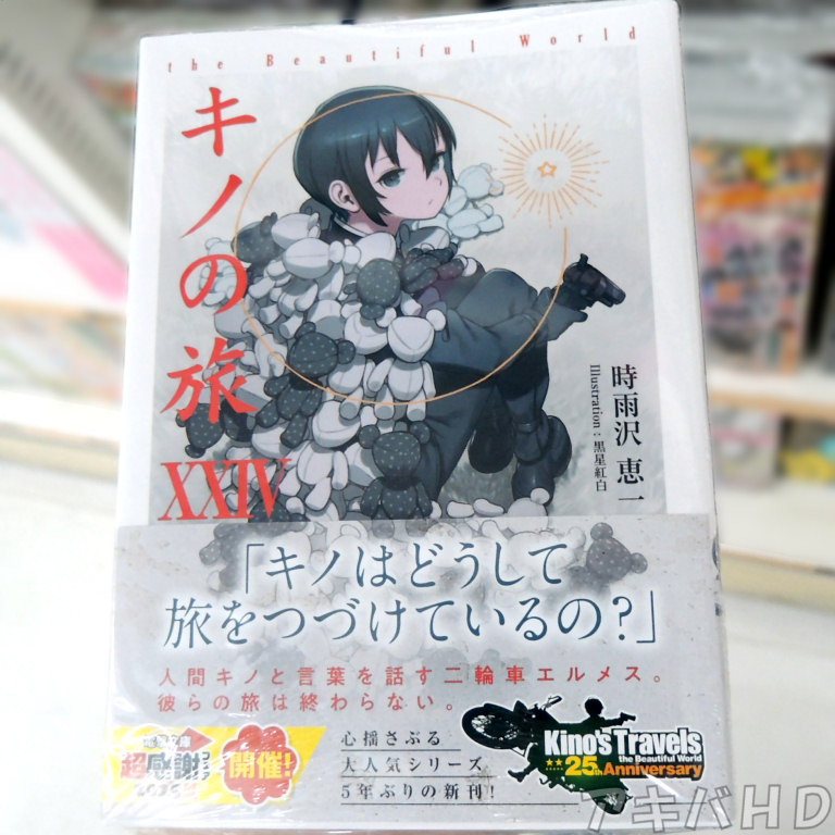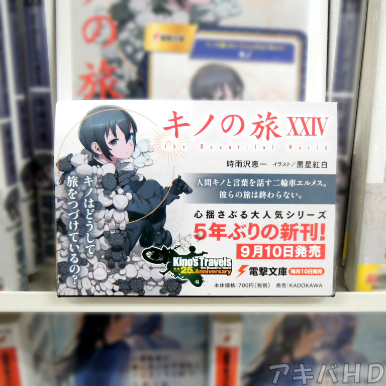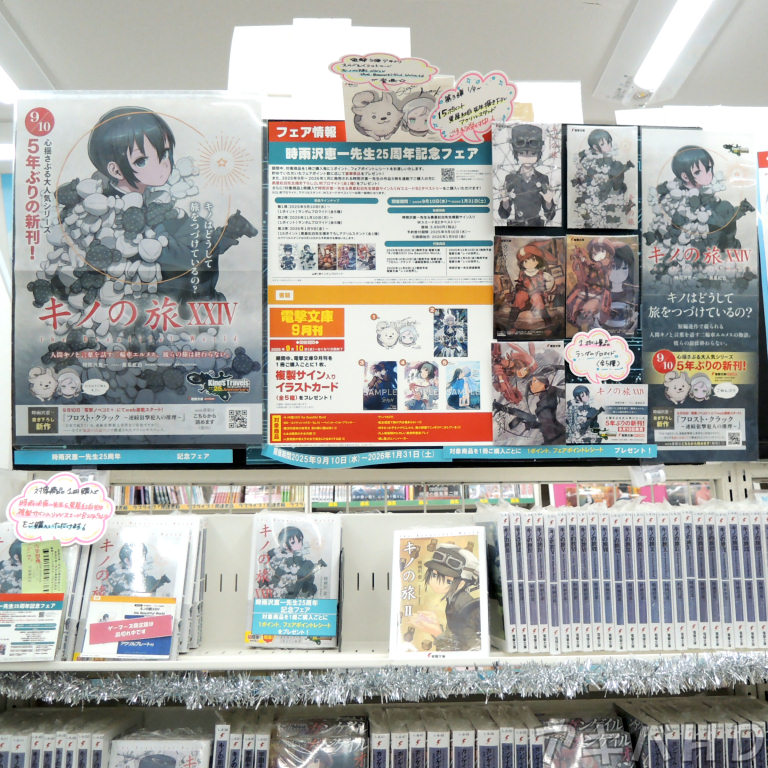 電撃文庫「キノの旅 the Beautiful World」24巻(著:時雨沢恵一氏、イラスト:黒星紅白氏)が9月10日に発売。ゲーマーズでは、「時雨沢恵一先生25周年記念フェア」としてコーナー展開していた他、ポスターや販促POPなどがあった。